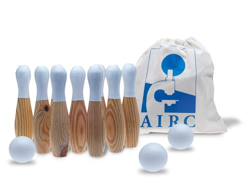 📏 9 birilli in legno nel sacchetto di stoffa, con logo AIRC. Dimensioni indicative birilli 16 x 11 x 3 cm.