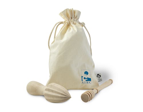 Un set composto da due accessori in legno: lo spremiagrumi manuale e il dosatore per il miele, in un bel sacchetto di stoffa. Un pensiero simpatico che conta davvero, per garantire continuità ai progetti di ricerca sui tumori pediatrici.